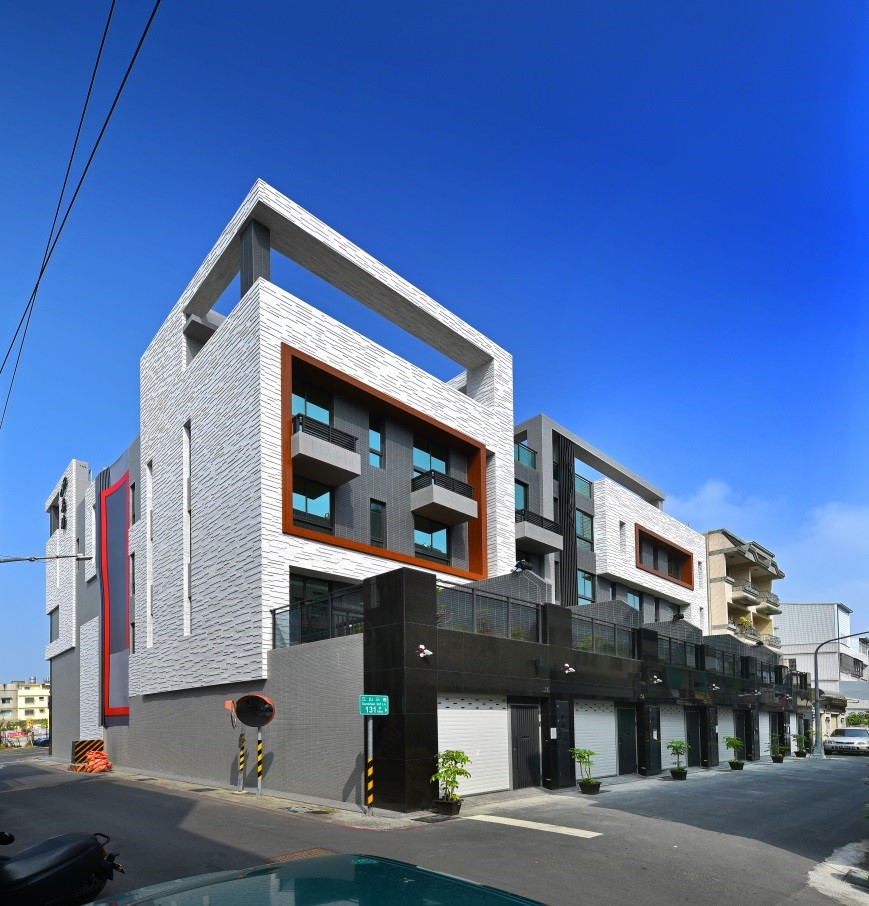 方盒建築量體獨特幾何立面層次,展現充滿力量的結構之美,大地灰階外觀、玻璃帷幕、亮彩色塊線條躍動豐沛視覺,令人注目的美學能量。